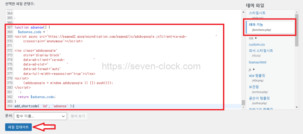 여기서 테마 파일 리스트에서 테마 기능(functions.php) 를 선택합니다.