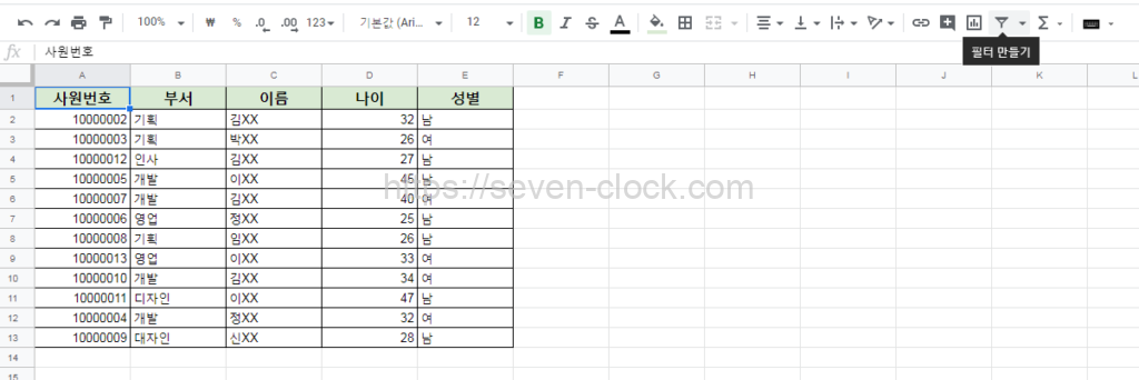 필터 만들기 버튼을 클릭 하면 시트에 적용이 됩니다.