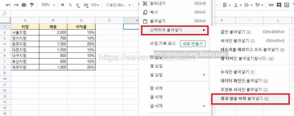 선택하여 붙여넣기 – 행과 열을 바꿔 붙여넣기를 클릭합니다.
