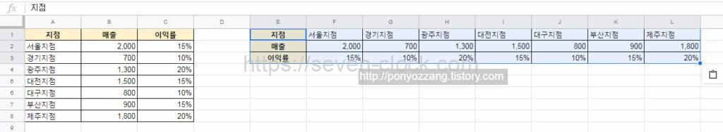수식을 사용하지 않고 행과 열 위치를 변경할 수도 있습니다.