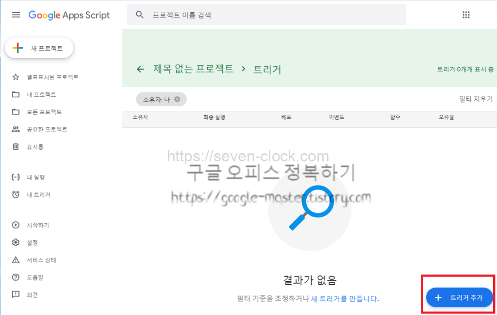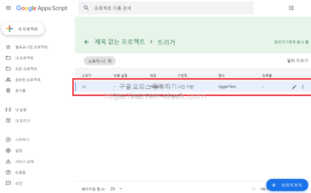 현재 프로젝트의 트리거를 클릭하면 새로운 창이 열립니다.