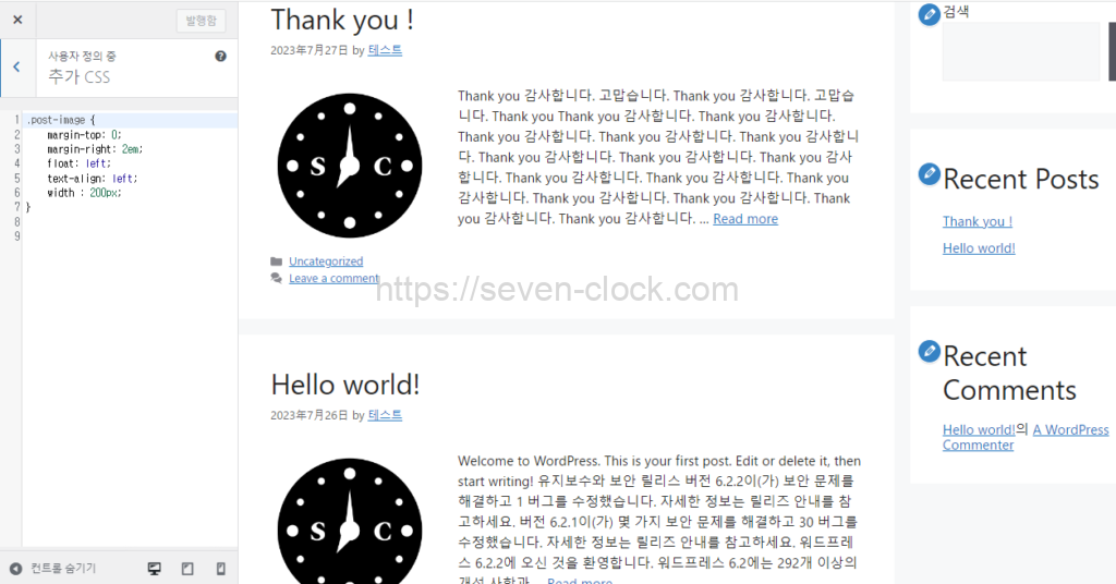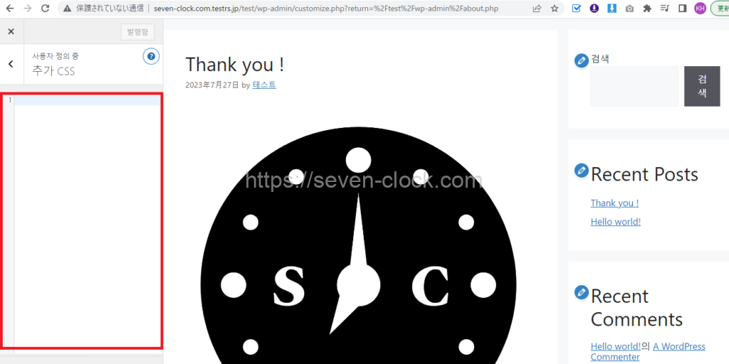 사용자 정의하기 화면에 들어가 추가 CSS메뉴를 클릭 합니다.